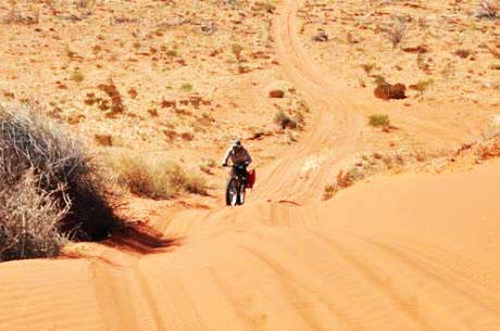 Ελάχιστοι είναι αυτοί που την έχουν διασχίσει με ποδήλατο και ένας απ? αυτούς ο Τέρις Φλάσκος. Με έκταση πάνω από 176.500 τετραγωνικά χιλιόμετρα, διαθέτει ορισμένους από τους μεγαλύτερους αμμόλοφους στη Γη. ?Ανυδρο τοπίο, με ελάχιστη βλάστηση, σκληρές συνθήκες ζωής και απίθανο κόκκινο χρώμα δημιουργούν ένα εξωπραγματικό σκηνικό, το οποίο μοιάζει να έχει βγει από κάποια κινηματογραφική ταινία. ?Αλλωστε στους «κόλπους» της έχουν γυριστεί κατά καιρούς διάφορες σκηνές από γνωστά φιλμ του Χόλιγουντ, ενώ διακρίνεται στις προτιμήσεις όσων λατρεύουν τις ειδικές διαδρομές στην άμμο. «Πρόκληση για δύναμη χαρακτήρα και τεστ αυτοπειθαρχίας» χαρακτήρισε τον άθλο του ο ομογενής ποδηλάτης.