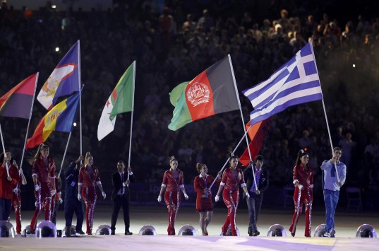 Είσοδος των σημαιοφόρων των 204 αποστολών που έλαβαν μέρος στους Αγώνες. Πρώτη η ελληνική σημαία με σημαιοφόρο αυτή τη φορά τον Σπύρο Γιαννιώτη, τέταρτος στα 10χλμ ανοιχτής θάλασσας.