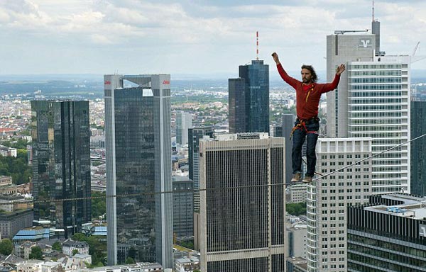 Στην προσπάθειά του να καταρρίψει το παγκόσμιο ρεκόρ στην αστική ακροβασία σε μεγάλο ύψος, ο 32χρονος Αυστριακός Reinhard Kleindl περπάτησε σε τεντωμένο σχοινί, 185 μέτρα πάνω από το έδαφος, ανάμεσα σε δύο ουρανοξύστες στη Φρανκφούρτη. Κι αν αυτό δεν προκαλεί καμία εντύπωση στους παράτολμους ορειβάτες, σας επισημαίνω ότι ο νεαρός είναι? υψοφοβικός!