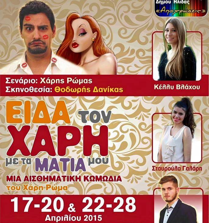 Στις δύο τελευταίες παραστάσεις της Θεατρικής Ομάδας Εθελοντών Νέων Δήμου Ήλιδας «Αποχρώσεις» με το έργο «Είδα τον Χάρη με τα μάτια μου» θα δώσει το παρόν ο σεναριογράφος του έργου και ηθοποιός Χάρης Ρώμας.
