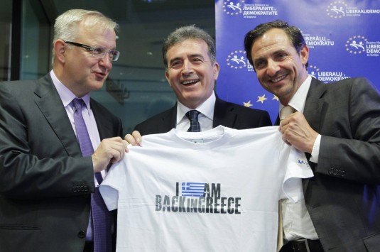 Όλα αυτά έλαβαν χώρα στις Βρυξέλλες όπου έγινε ένα σεμινάριο για την οικονομική κρίση στην Ελλάδα. Μετά χαράς πόζαραν ο ευρωβουλευτής Γιώργος Χατζημαρκάκης και ο επίτροπος Ολι Ρεν κρατώντας το μπλουζάκι στα χέρια τους για τους δημοσιογράφους.