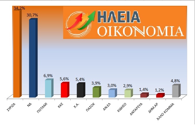 Προβάδισμα 3,5% του ΣΥΡΙΖΑ έναντι της ΝΔ καταγράφεται στη διαδικτυακή δημοσκόπηση του ΗΛΕΙΑ ΟΙΚΟΝΟΜΙΑ που διεξήχθη απο 12/1 έως 17/1/2015.