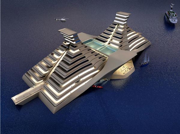 Το ξενοδοχείο θα επιπλέει στο νερό και η προσέγγιση θα γίνεται με σκάφη, ενώ ειδικό ελικοδρόμιο θα υπάρχει στην κορυφή για τους απαιτητικούς. Εσωτερικές και εξωτερικές πισίνες αλλά και η διαμόρφωση μιας παραλίας σε ένα σημείο του κτηρίου θα κάνουν τη διαφορά για όσους επιθυμούν να βάλουν (αρκετά) βαθιά το χέρι στην τσέπη κάνοντας το όνειρο των τέλειων διακοπών? πραγματικότητα!