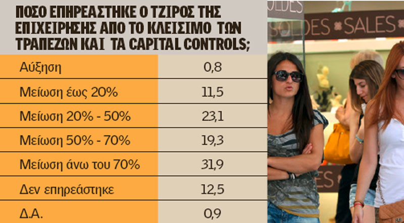 Κάθετη πτώση στον κύκλο εργασιών τους λόγω της επιβολής κεφαλαιακών έλεγχων (capital controls) σημείωσαν 9 στις 10 επιχειρήσεις, σύμφωνα με έρευνα το ΙΜΕ ΓΣΕΒΕΕ που έγινε στο διάστημα 21 με 27 Ιουλίου 2015. Σύμφωνα με την ίδια έρευνα τρεις στις δέκα επιχειρήσεις σημείωσαν μείωση πάνω από 70%, ενώ συνολικά για τις επιχειρήσεις η μείωση του κύκλου εργασιών ήταν μεσοσταθμικά 48%. Άμεση συνέπεια ήταν η συρρίκνωση της κατανάλωσης κατά 50% ή κατά 3,8 δισ. ευρώ κατά το διάστημα αυτό. Με μια μετριοπαθή εκτίμηση υπολογίζεται ότι από αυτή την μείωση το ελληνικό δημόσιο έχασε 570 εκατ. ευρώ από έμμεσους φόρους. Αυτές είναι οι άμεσες επιπτώσεις από την επιβολή κεφαλαιακών ελέγχων τις πρώτες δύο εβδομάδες.