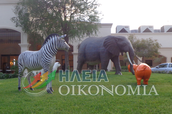Πάππιες, χήνες, προβατάκια, χοίροι, ζέμπρες σε κανονικά μεγέθη, ακόμα και ένας τεράστιος ελέφαντας στολίζουν την είσοδο του κεντρικού κτιρίου στο ξενοδοχειακό συγκρότημα Grecotel στα Λουτρά Κυλλήνης.