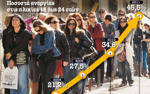 Κύρια «θύματα» είναι οι νέοι 15- 24 ετών, αλλά και η, πλέον παραγωγική, επόμενη ηλικιακή ομάδα, στην οποία περίπου ένας στους δύο είναι άνεργος.