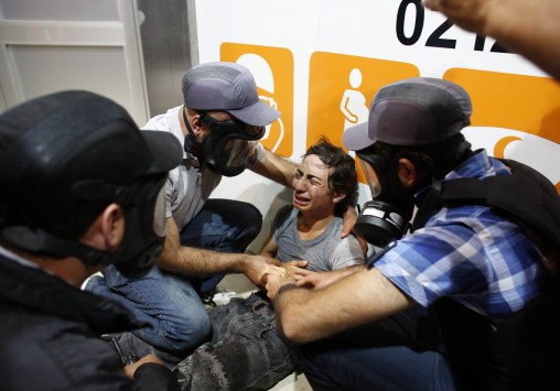 Ένας αστυνομικός πλησιάζει μια κοπέλα που πνίγεται από τα χημικά. Ένας άνδρας που περπατά με πατερίτσες υψώνει ανάστημα στους αστυνομικούς…