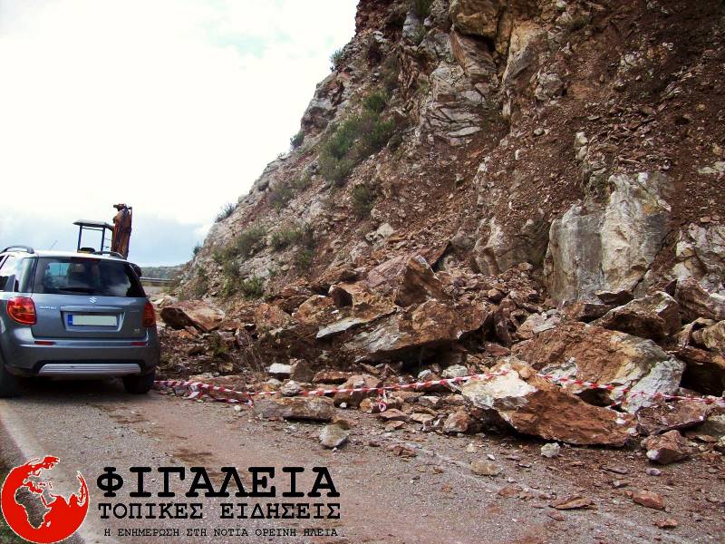 Άγιο είχαν οι διερχόμενοι οδηγοί που κινούνταν την περασμένη Κυριακή στον ορεινό οδικό άξονα από τα Πετράλωνα Φιγαλείας προς τα Περιβόλια και αυτό καθώς τα ξημερώματα και λόγω των κακών καιρικών συνθηκών που επικρατούσαν σε όλη τη Νότια Ορεινή Ηλεία, μια μεγάλη κατολίσθηση με μεγάλα βράχια έκλεισε το δρόμο προς τα χωριά της Φιγαλείας (Περιβόλια – Στόμιο – Αρχαία Φιγαλεία – Δραγώγι) και η κυκλοφορία διεκόπη για περίπου 5 ώρες μέχρι τις πρωινές ώρες της Κυριακής. Εκεί έσπευσε το πρωί της Κυριακής ο πρόεδρος του Δ.Δ.Πετραλώνων Χαράλαμπος Αποστολόπουλος,ο οποίος αρχικά ενημέρωσε την Τροχαία και ύστερα με δικό του αγροτικό μηχάνημα καθάρισε το 1/3 του δρόμου με σκοπό να περνάνε έστω και οριακά τα οχήματα των κατοίκων αλλά και των δικαστικών λόγω των εθνικών εκλογών. Ωστόσο η κυκλοφορία διεξάγονταν με μεγάλη δυσχέρεια με τον πρόεδρο του Δ.Δ.Πετραλώνων να τοποθετεί κορδέλες στο σημείο.