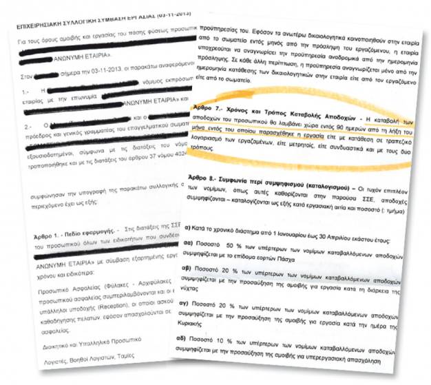 Νέα ήθη και κανόνες στην αγορά εργασίας, φέρνουν οι επιχειρησιακές συμβάσεις που υπογράφονται μαζικά εν μέσω ύφεσης, με την επίκληση της δύσκολης οικονομικής κατάστασης των επιχειρήσεων. Και στις 3 Νοεμβρίου, όπως αποκαλύπτει η Ημερησία, είχαμε τη πρώτη επιχειρησιακή σύμβαση εργασίας που νομιμοποιεί την καθυστέρηση ως τρεις μήνες στην καταβολή των μισθών των εργαζομένων. Όπως αναφέρεται χαρακτηριστικά, στο άρθρο 7 της σύμβασης: «Η καταβολή των αποδοχών του προσωπικού θα λαμβάνει χώρα εντός 90 ημερών από τη λήξη του μήνα εντός του οποίου παρασχέθηκε η εργασία, είτε με κατάθεση σε τραπεζικό λογαριασμό των εργαζομένων είτε μετρητοίς είτε συνδυαστικά και με τους δύο τρόπους». Η εν λόγω σύμβαση υπεγράφη σε εταιρεία παροχής υπηρεσιών φύλαξης.