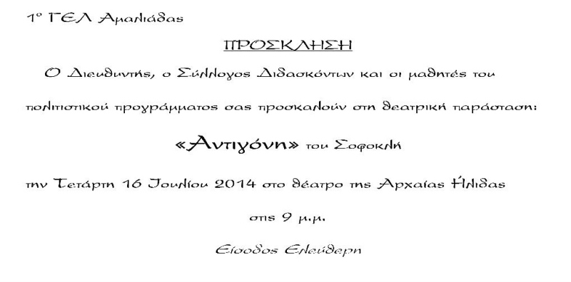 Θεατρική παράσταση “Αντιγόνη” του Σοφοκλή θα δοθεί από το πρώτο ΓΕΛ Αμαλιάδας , την Τετάρτη, 16/07/2014 και ώρα 21:00  στο θέατρο της Αρχαίας Ήλιδας.