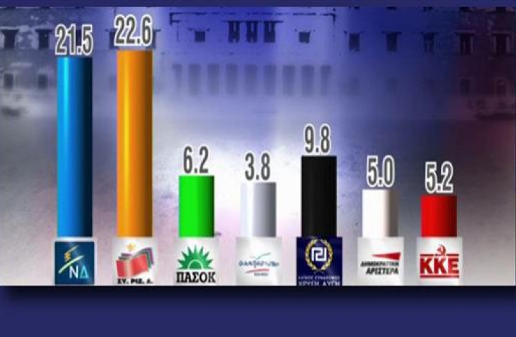 Συγκεκριμένα, στην πρόθεση ψήφου ο ΣΥΡΙΖΑ προηγείται με 22,6% και ακολουθούν η ΝΔ με 21,5%, η Χρυσή Αυγή με 9,8%, το ΠΑΣΟΚ με 6,2%, το ΚΚΕ με 5,2%, η ΔΗΜΑΡ με 5% και οι Ανεξάρτητοι Έλληνες με 3,8%.