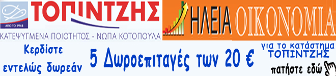 Το κατάστημα ΤΟΠΙΝΤΖΗΣ και η τοπική ενημερωτική ιστοσελίδα ΗΛΕΙΑ ΟΙΚΟΝΟΜΙΑ (www.iliaoikonomia.gr) θέλοντας να στηρίξουν την τοπική κοινωνία σε μια περίοδο μεγάλης οικονομικής κρίσης προσφέρουν σε 5 τυχερούς από μια δωροεπιταγή αξίας 20 ευρώ για να πραγματοποιήσουν αγορές στο κατάστημα Τοπιντζής. Η συνολική αξία των δωροεπιταγών είναι 100 ευρώ.