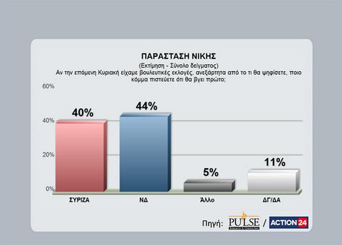 Η Νέα Δημοκρατία προηγείται σημαντικά στην παράσταση νίκης με 44%, έναντι 40% του ΣΥΡΙΖΑ.