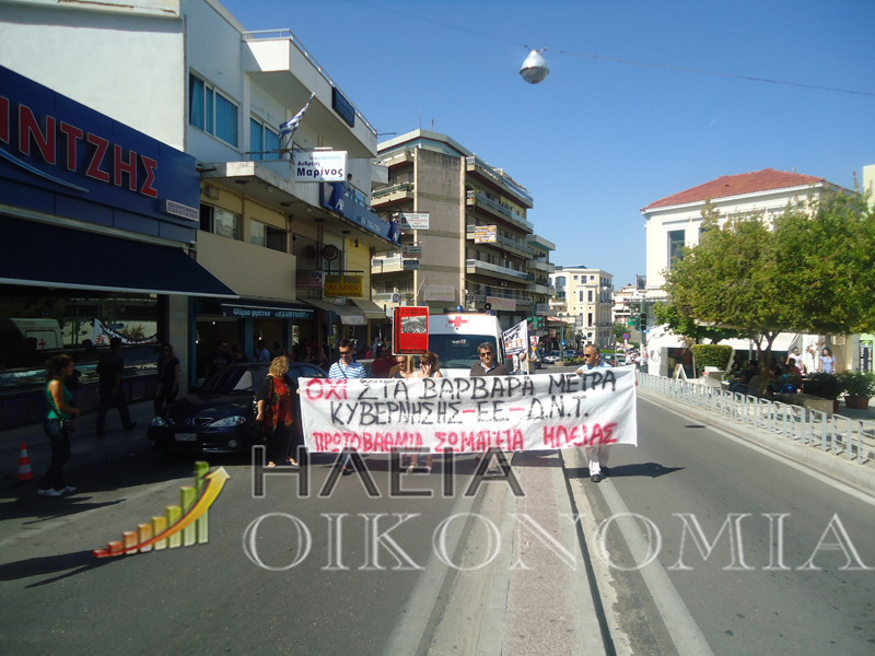 Σε εξέλιξη βρίσκεται η μεγάλη πορεία στο κέντρο του Πύργου, στα πλαίσια της απεργιακής κινητοποίησης που έχει προγραμματιστεί για σήμερα 26 Σεπτεμβρίου. Χαρακτηριστικό της πορείας αυτήν την στιγμή είναι η παρουσία ενός ασθενοφόρου (φωτό) και πλήθος συγκεντρωμένων διαφόρων Συλλόγων και σωματείων στο σώμα της πορείας