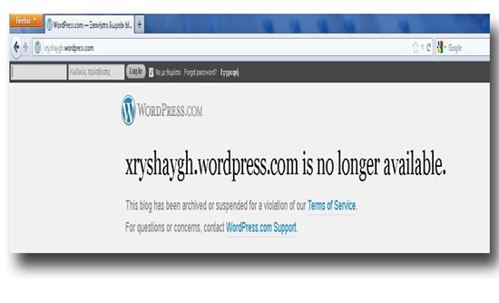 Ο παγκόσμιο ιστότοπος, WorldPress.com, έθεσε εκτός λειτουργίας τη σελίδα της “Χρυσής Αυγής” καθώς παραβιάζει τους όρους που διέπουν το συγκεκριμένο παγκόσμιο ιστολόγιο. Συγκεκριμένα γράφει: