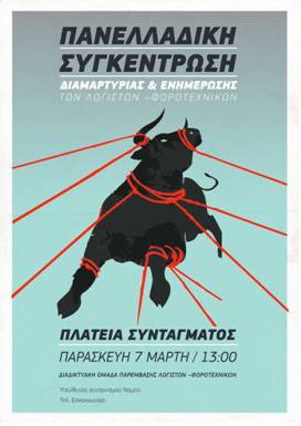 Οι λογιστές φοροτεχνικοί συγκεντρωνόμαστε στο Σύνταγμα στις 7/3 ώρα 13:00, καλώντας ΟΛΟΥΣ μιας και όλους μας αφορά, για να διαμαρτυρηθούμε για τα εξοντωτικά πρόστιμα του Ν.4174 καθώς και τις εξοντωτικές συνθήκες εργασίας, την υπέρμετρη φορολόγηση, τις αυξημένες υποχρεώσεις τις οποίες καλούμαστε να φέρουμε εις πέρας. Να ζητήσουμε κατάργηση των άρθρων 53-60 του παραπάνω νόμου.