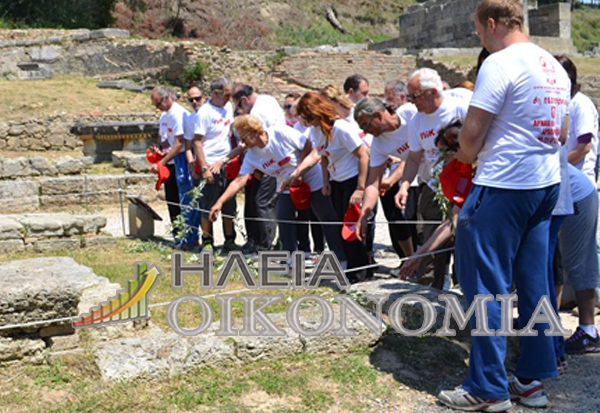 Στον αρχαιολογικό χώρο όλοι οι συμμετέχοντες άφησαν από ένα κλαδί ελιάς στον χώρο αφής της ολυμπιακής φλόγας.