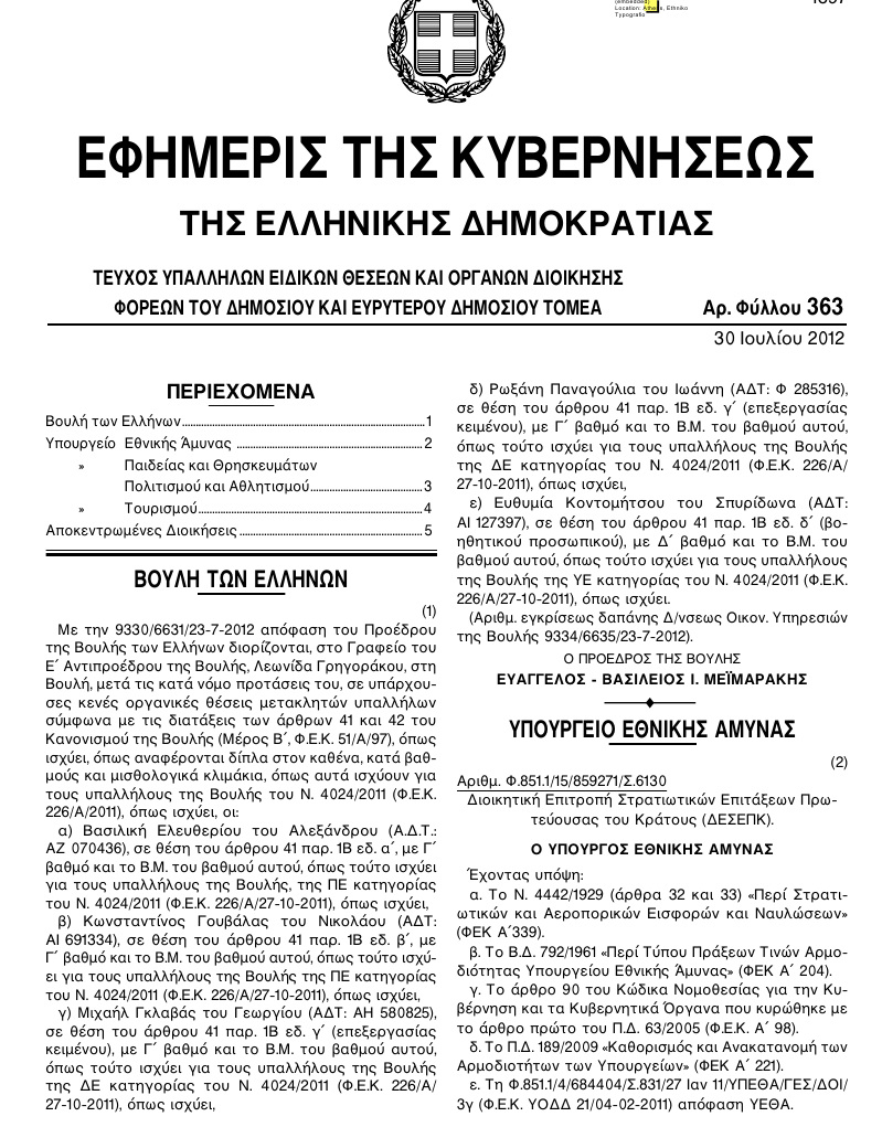 Συγκεκριμένα, με απόφαση του Προέδρου της Βουλής στις 30 Ιουλίου 2012, με το ΦΕΚ 363 (εικόνα) διορίστηκε στο γραφείο του πέμπτου αντιπροέδρου της Βουλής, Λεωνίδα Γρηγοράκου, ο κ. Κωνσταντίνος Γουβάλας του Νικολάου.