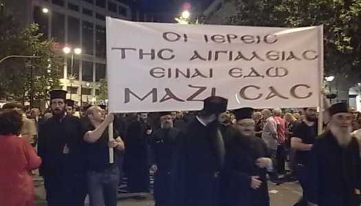 Κρατώντας πανό που έγραφε «οι ιερείς της Μητρόπολης Αιγιαλείας είναι εδώ μαζί σας» ιερείς από τα Καλάβρυτα διαδήλωσαν μαζί με τους εκατοντάδες χιλιάδες «αγανακτισμένους».