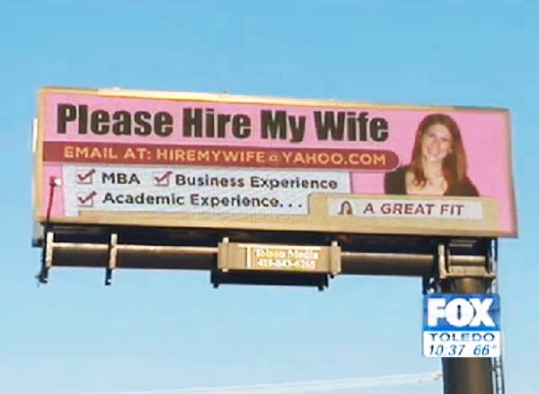 Ο Brandon Stuard βρήκε έναν πρωτότυπο τρόπο για να προβάλλει τα? επαγγελματικά προσόντα της συζύγου του, προκειμένου να τη βοηθήσει να βρει δουλειά, παρακινώντας παράλληλα τους επίδοξους εργοδότες με τη φράση «Παρακαλώ, προσλάβετε τη γυναίκα μου»! Πιο συγκεκριμένα, ο Brandon νοίκιασε μια διαφημιστική πινακίδα σε κεντρικό αυτοκινητόδρομο στο Οχάιο, αναγράφοντας τη φράση «Please, Hire my Wife» (σ.σ. «Παρακαλώ, προσλάβετε τη γυναίκα μου»), σε συνδυασμό με τα βασικά προσόντα της γυναίκας του (MBA, εργασιακή εμπειρία κ.ά) και ένα e-mail επικοινωνίας, μπροστά σε χιλιάδες νέα πρόσωπα. Η σύζυγός του, Holly Stuard, δούλευε ως υπάλληλος στο Πανεπιστήμιο του Τολέδο, όταν πριν από κάποιους μήνες έχασε τη δουλειά της λόγω περικοπών.
