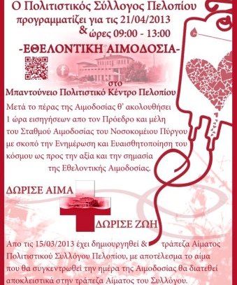 Εθελοντική αιμοδοσία έχει προγραμματιστεί να πραγματοποιηθεί από τον Εκπολιτιστικό Σύλλογο Πελοπίου την Κυριακή 21-04-2013 και ώρες 09:00 – 13:00 στο Μπαντούνειο Πολιτιστικό Κέντρο Πελοπίου.