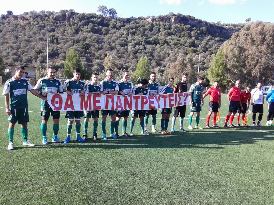 Συγκεκριμένα, όπως βλέπετε στην φωτογραφία μας ο αρχηγός της ομάδας του Παναθηναϊκού Σωτήρης Κριτσωτάκης έκανε πρόταση γάμου στην αγαπημένη του και διαιτητής Τάνια Τσαούση με ένα μεγάλο πανό που κρατούσαν όλοι οι παίκτες του τριφυλλιού.