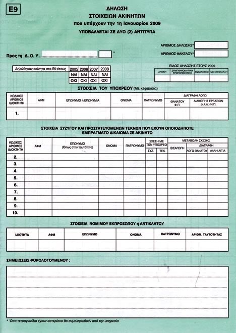 Περισσότεροι από 600.000 φορολογούμενοι υπολογίζεται ότι θα υποβάλουν φέτος το έντυπο Ε9 στην εφορία. Πρόκειται για φυσικά πρόσωπα που κατά τη διάρκεια του 2010 είχαν μεταβολές στην ακίνητη περιουσία τους ή και στην οικογενειακή τους κατάσταση. Το υπουργείο Οικονομικών συμπεριέλαβε και φέτος στο βιβλιάριο οδηγιών για τη συμπλήρωση των δηλώσεων φορολογίας εισοδήματος ειδικό κεφάλαιο με οδηγίες για τη συμπλήρωση του νέου εντύπου Ε9 του έτους 2011.