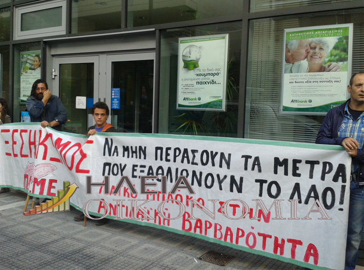 Στο κλείσιμο της εισόδου του καταστήματος της ΑΤΕ Bank στην οδό Μανωλοπούλου και της αλυσίδας καταστημάτων SPRIDER stores στον Πύργο προχώρησαν σήμερα το πρωί μέλη του ΠΑΜΕ Νομού Ηλείας.