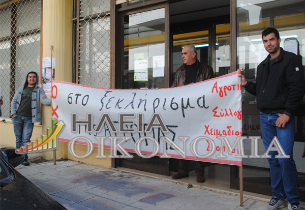 Με πανό που έγραφε “ΟΧΙ στο ξεκλήρισμα της αγροτιάς” απέκλεισαν την είσοδο των γραφείων της Ένωσης στην συμβολή των οδών Τάκη Πετροπούλου και Κοκκίνου στον Πύργο.