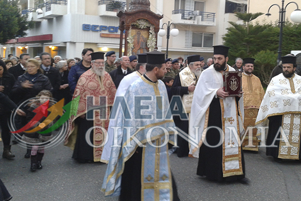 Η πομπή πέρασε απο κεντρικούς δρόμους της πόλης υπο εμβατήρια της Φιλαρμονικής Πύργου “Απόλλων” και ακολουθούμενη απο πλήθος πιστών. Λίγο μετά της 17:30 έφτασε στον Ι.Ν.Αγίας Κυριακής παρουσία του Μητροπολίτη Ηλείας κ.κ.Γερμανού, όπου και έπειτα ακολούθησε Εσπερινός.