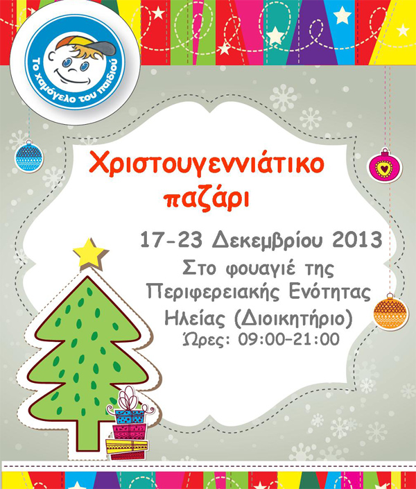 Και φέτος τα Χριστούγεννα «Το Χαμόγελο του Παιδιού» σας προσκαλεί στο Χριστουγεννιάτικο Bazaar που θα πραγματοποιηθεί στο Φουαγιέ της Περιφερειακής Ενότητας Ηλείας (Διοικητήριο), από τις 17 έως και τις 23 Δεκεμβρίου 2013 (ώρες λειτουργίας 9:00-21:00).