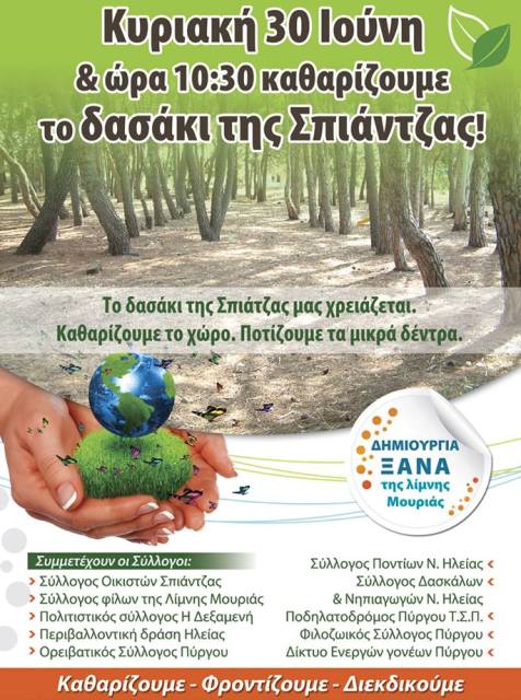 Σε καθαρισμό στο δασάκι της Σπίατζας θα προβούν σύλλογοι απο την περιοχή της Σπίαντζας, του Πύργου την Κυριακή 30 Ιουνίου στις 10:30 το πρωί.