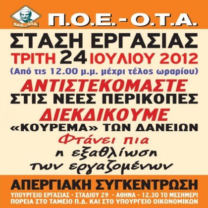 Η κινητοποίηση γίνεται κατά των νέων περικοπών των ασφαλιστικών και συνταξιοδοτικών δικαιωμάτων γράφει η αφίσα της ΠΟΕ-ΟΤΑ. Διεκδικείται επίσης το «κούρεμα» των δανείων.