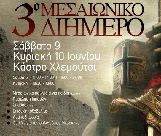 Στην εποχή του Μεσαίωνα και των ιπποτών θα ταξιδέψουν όσοι βρεθούν στο Κάστρο Χλεμούτσι το Σαββατοκύριακο 9 και 10 Ιουνίου. Ρομαντικοί ιππότες, ευγενικές πυργοδέσποινες, αγέρωχοι καβαλάρηδες και άριστοι τοξότες θα σας ταξιδέψουν σε μια άλλη εποχή – στην εποχή που το Χλεμούτσι βρισκόταν στις μεγάλες του δόξες – παίζοντας σημαντικό ρόλο στα Ηλειακά δρώμενα.