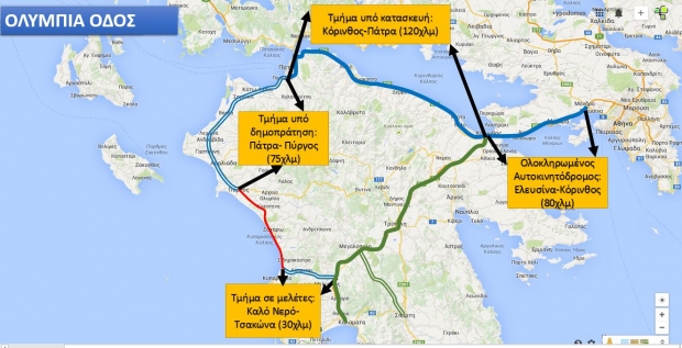 «Η ολοκλήρωση του αυτοκινητόδρομου της Ολυμπίας Οδού στο τμήμα Πάτρα-Πύργος τείνει να εξελιχθεί σε σύγχρονο «Γεφύρι της Άρτας». Ο μέχρι τώρα σχεδιασμός προέβλεπε κατασκευή του δημοσίου έργου με χρηματοδότηση από το ΕΣΠΑ (ΣΕΣ) 2014-2020. Το αρχικό κόστος υπολογιζόταν σε 443 εκατ. ευρώ συν 32 εκατ. ευρώ για συμπληρωματικές δαπάνες, που αφορούν σε απαλλοτριώσεις και αρχαιολογικές έρευνες.