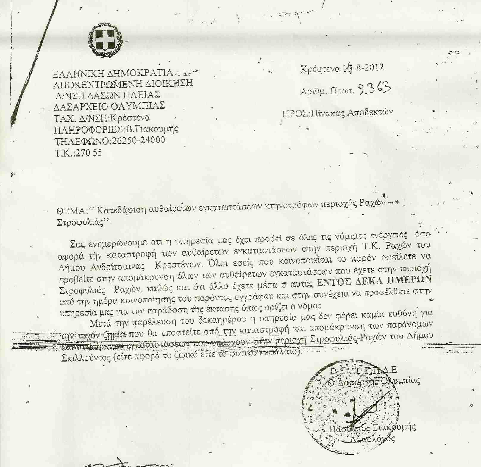 Μετά την παρέλευση του δεκαημέρου, συνεχίζει το έγγραφο, η υπηρεσία μας δε φέρει καμία ευθύνη για την τυχόν ζημία που θα υποστείτε από την καταστροφή και απομάκρυνση των παράνομων και αυθαίρετων εγκαταστάσεων που υπάρχουν στην περιοχή Στροφυλιάς-Ραχών του δήμου Σκιλλούντος (είτε αφορά το ζωϊκό, είτε το φυτικό κεφάλαιο).