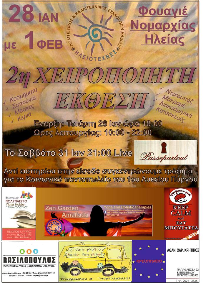 Την Κυριακή 1 Φεβρουαρίου στο φουαγιέ της Περιφερειακής Ενότητας Ηλείας, ο σύλλογος “Ηλειοτέχνες” διοργανώνουν την 2η Χειροποίητη Έκθεσή του με φιλανθρωπικούς σκοπούς.