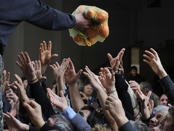 Πεφτουν ο ένας πάνω στον άλλο για λίγα φρούτα και λαχανικά, με τα χέρια ψηλά περιμένουν να πάρουν μερικά πορτοκάλια, μια σακούλα πατάτες ή κρεμμύδια