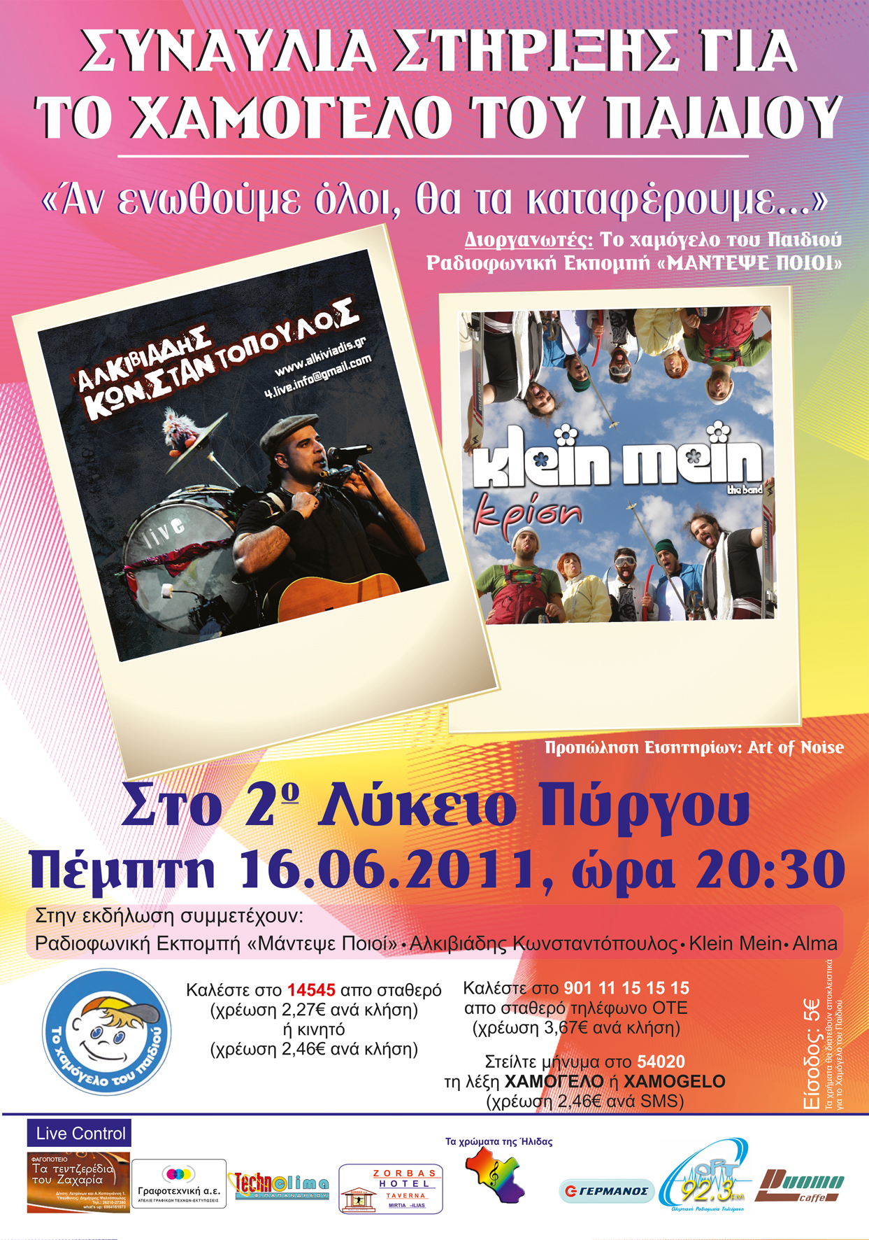 Το “Χαμόγελο του παιδιού” και η μουσική εκπομπή της ΟΡΤ FM “Μάντεψε ποιοί” διοργανώνουν Συναυλία την Πέμπτη 16/6/2011 και ώρα 20.30 στο προαύλιο του 2ου Γυμνασίου-Λυκείου Πύργου.
