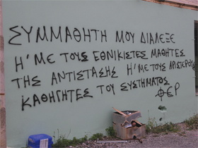 Άλλες φορές χιουμοριστικά και άλλοτε καυτηριάζοντας την καθημερινότητα, τα συνθήματα στους τοίχους των πόλεων πάντα ασκούν μια ιδιαίτερη γοητεία. Καθένα από αυτά αποτελεί μια ξεχωριστή κατηγορία τέχνης και την μοναδική έκφραση μιας φωνής που δεν έχει άλλο τρόπο να ακουστεί. Απολαύστε μερικά από τα πιο πετυχημένα συνθήματα που έχουν γραφτεί σε τοίχους, μέσα από το 1ο μέρος του αφιερώματος που ακολουθεί.