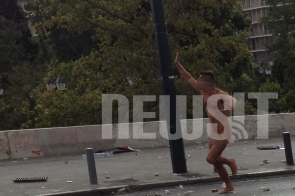 Εκεί που βρισκόταν σε εξέλιξη ο… πετροπόλεμος διαδηλωτών-ΜΑΤ, ένας νεαρός άνδρας, ένας ξένος διαδηλωτής, άρχισε να τρέχει γυμνός στη Βασιλέως Γεωργίου, ανάμεσα σε άνδρες των ΜΑΤ και να χαιρετά τα πλήθη.