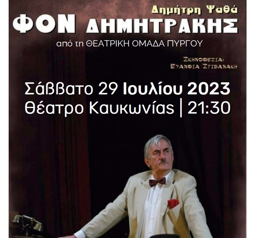 Το πάντα επίκαιρο έργο του Δημήτρη Ψαθά, τον Φον Δημητράκης στο θέατρο Καυκωνίας σε σκηνοθεσία της Ευανθίας Στιβανάκη θα παρουσιάσει, στο πλαίσιο του Διεθνές Φεστιβάλ Τεχνών Αρχαίας Ολυμπίας, η ΘΕΑΤΡΙΚΗ ΟΜΑΔΑ ΠΥΡΓΟΥ.