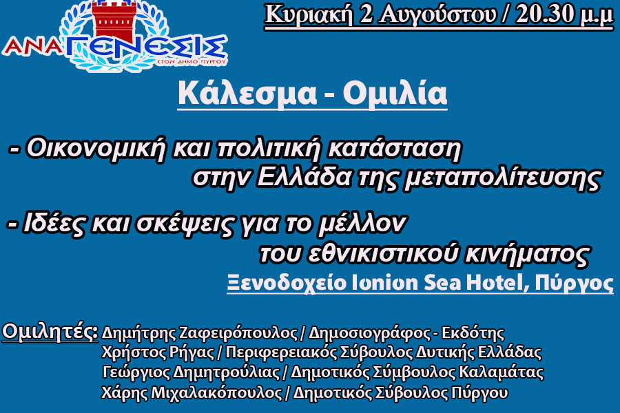 Άλλωστε και στους ομιλητές της εκδήλωσης στον Πύργο περιλαμβάνονται δύο πρώην πρωτοκλασάτα στελέχη της Χρυσής Αυγής, που αποχώρησαν (οι Ζαφειρόπουλος και Ρήγας).