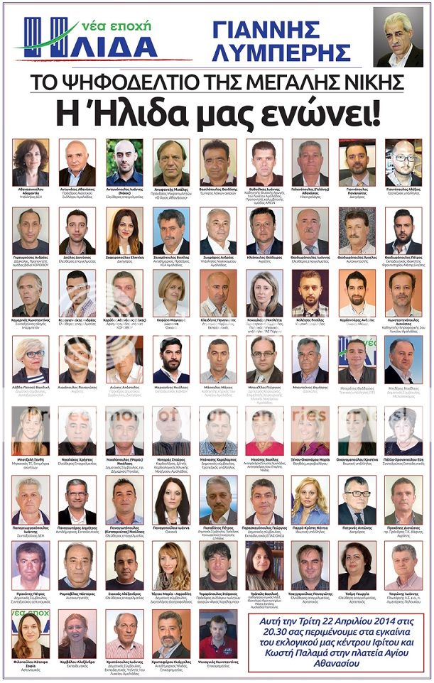 Στην δημοσιότητα δόθηκαν οι 68 υποψήφιοι για τις δημοτικές εκλογές του Μαϊου που συμμετέχουν με τον συνδυασμό του κ. Λυμπέρη για τον Δήμο Ήλιδας.