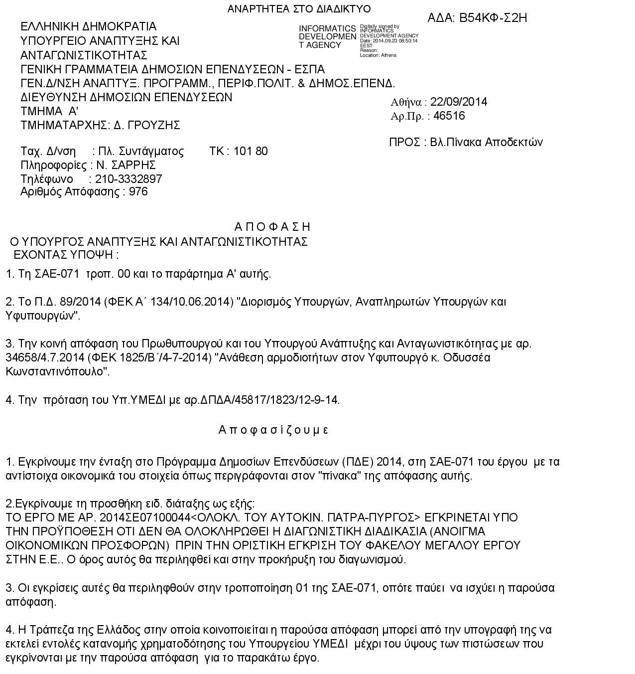 Με την απόφαση της 22-9-2014 του Υπουργού Ανάπτυξης το έργο εντάχθηκε στο Πρόγραμμα Δημοσίων Επενδύσεων του έτους 2014, μόνο και μόνο για να πάρει Κωδικό και να μπορέσει να δημοπρατηθεί.