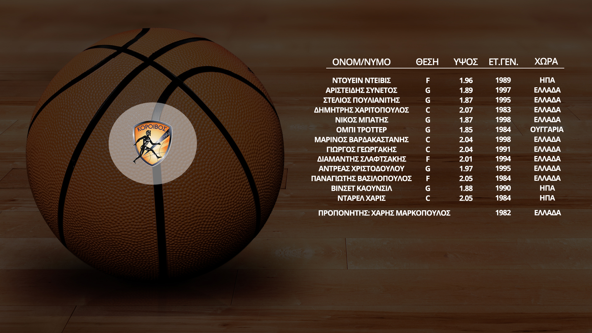 Κόροιβος (Μαρκόπουλος): Ντέιβις 10 (2), Τρότερ 7 (1), Σλαφτσάκης 5, Χριστοδούλου 8, Χάρις 18, Πουλιανίτης 2, Γεωργάκης 1, Βασιλόπουλος 7 (1), Κάουνσιλ 6.