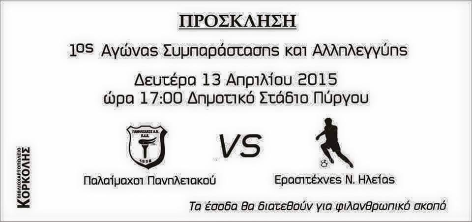 Ο 1ος (αφού φιλοδοξία των διοργανωτών είναι να καθιερωθεί και να γίνει μόνιμο γεγονός) “Αγώνας Συμπαράστασης και Αλληλεγγύης”, ανάμεσα σε ομάδα Παλαίμαχων Πανηλειακού και ομάδα Ερασιτεχνών παικτών Ηλείας, ήδη προγραμματίστηκε για τη Δευτέρα του Πάσχα, 13 Απριλίου, στις 5.00 το απόγευμα στο Στάδιο Πύργου.