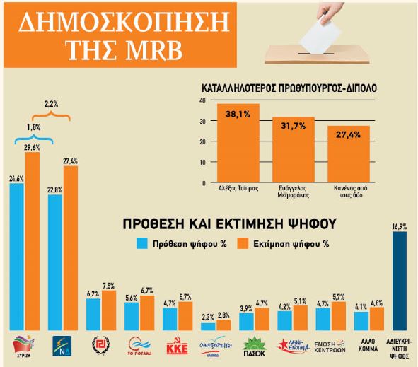 Στο 2,2% εμφανίζει τη διαφορά ΣΥΡΙΖΑ-ΝΔ δημοσκόπηση της MRB