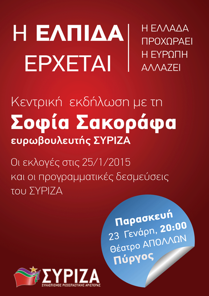 Ανοιχτή κεντρική πολιτική εκδήλωση στον Πύργο την Παρασκευή και ώρα 8.00 μ.μ., στο Θέατρο ΑΠΟΛΛΩΝ διοργανώνει ο ΣΥΡΙΖΑ. Βασική ομιλητής θα είναι η ευρωβουλευτής Σοφία Σακοράφα. Θέμα της εκδήλωσης είναι «Οι εκλογές της Κυριακής – Οι προγραμματικές δεσμεύσεις του ΣΥΡΙΖΑ».