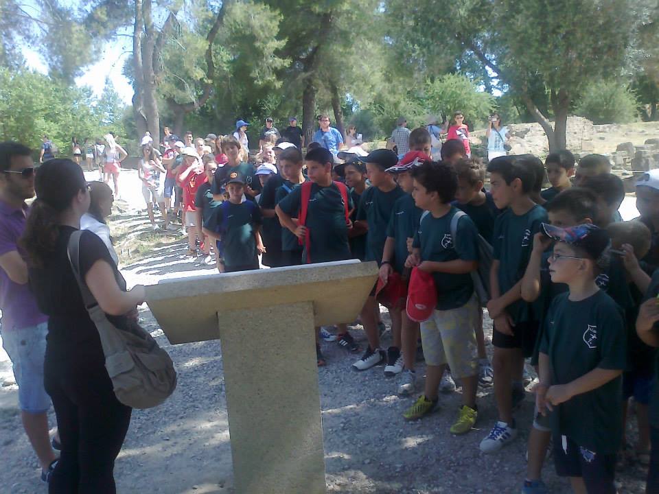 Η πρώτη εξόρμηση ήταν στον Αρχαιολογικό χώρο, ο οποίος έσφυζε στη ζωή από τους επισκέπτες τουρίστες ανά την υφήλιο. Το δύσκολο έργο ξενάγησης των παιδιών ανέλαβε η γνωστή μας Χρυσούλα Μαυράκη. Με το δικό της τρόπο κατάφερε να καθηλώσει τα παιδιά. Διανύοντας την αρχαία πόλη και αναλύοντας την ιστορία σημαντικών κτιρίων όπως το Πρυτανείο, το Ηραίο όπου βρέθηκε και ο Ερμής του Πραξιτέλη, το Λεωνιδαίο όπου φιλοξενούνταν οι επίσημοι προσκεκλημένοι των Αγώνων, η Παλαίστρα του 3ου π.χ. αιώνα και το Γυμνάσιο που ήταν χώρος προετοιμασίας των αθλητών οι μικροί ποδοσφαιριστές συνέλεξαν πληροφορίες για την Αρχαία Ολυμπία. Όροι όπως εκεχειρία, κλαδί ελιάς, αλλά και αθλήματα όπως δρόμος, άλμα εις μήκος, δισκοβολία, που είχαν διδαχτεί στο σχολείο επανήλθαν στη μνήμη. Διανύοντας τη στοά της Ηχούς εισήλθαν στο στάδιο, όπου είχαν την ιδιαίτερη τιμή να συμμετάσχουν σε αγώνα δρόμου στο αρχαίο στάδιο όλοι οι μικροί αθλητές.
